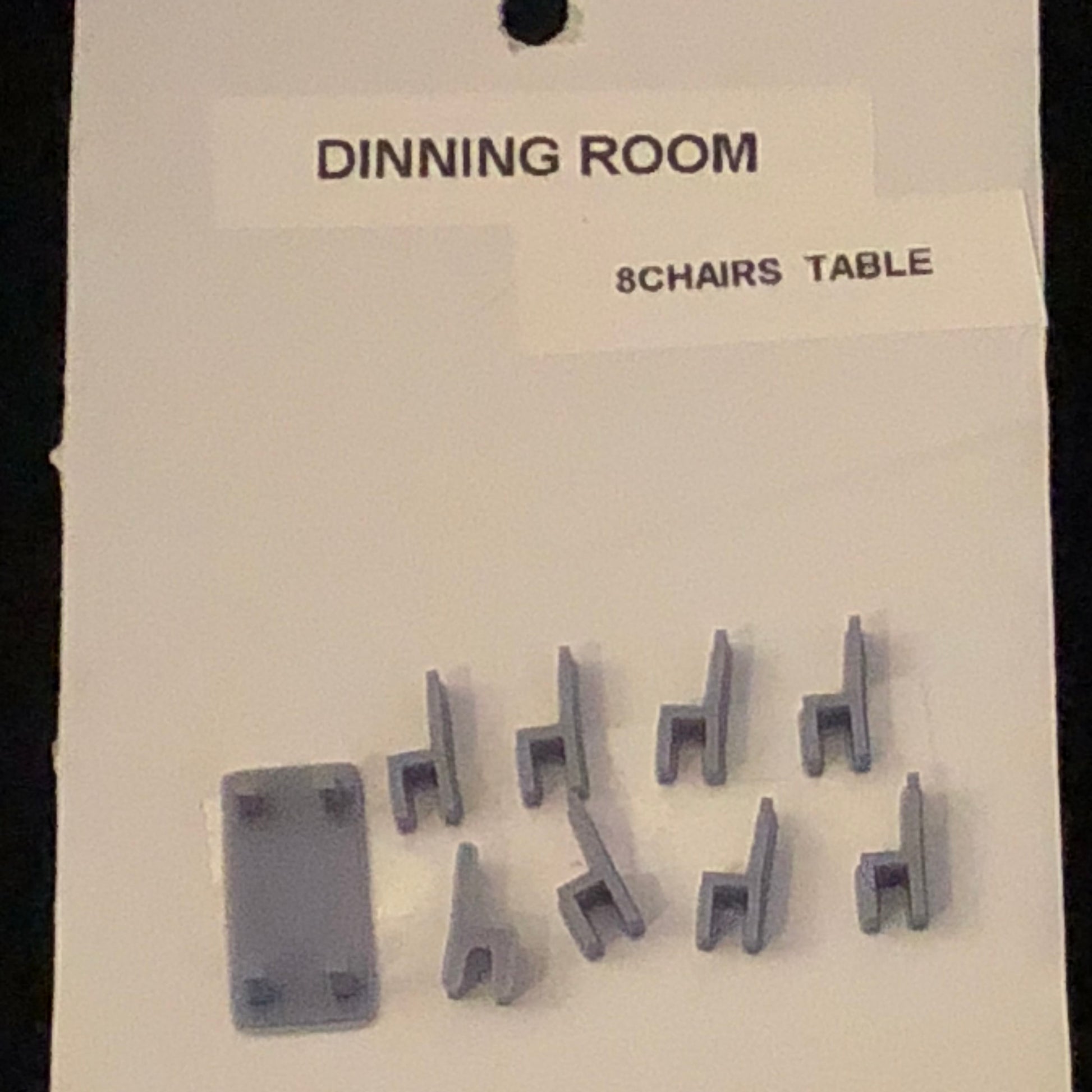 "Transform your model railroad home into a lively and realistic scene with this Ho scale Dinning Room set. Complete with a table and 8 chairs, this package adds a touch of detail to your layout. (No need to dine alone on your miniature train journey!)