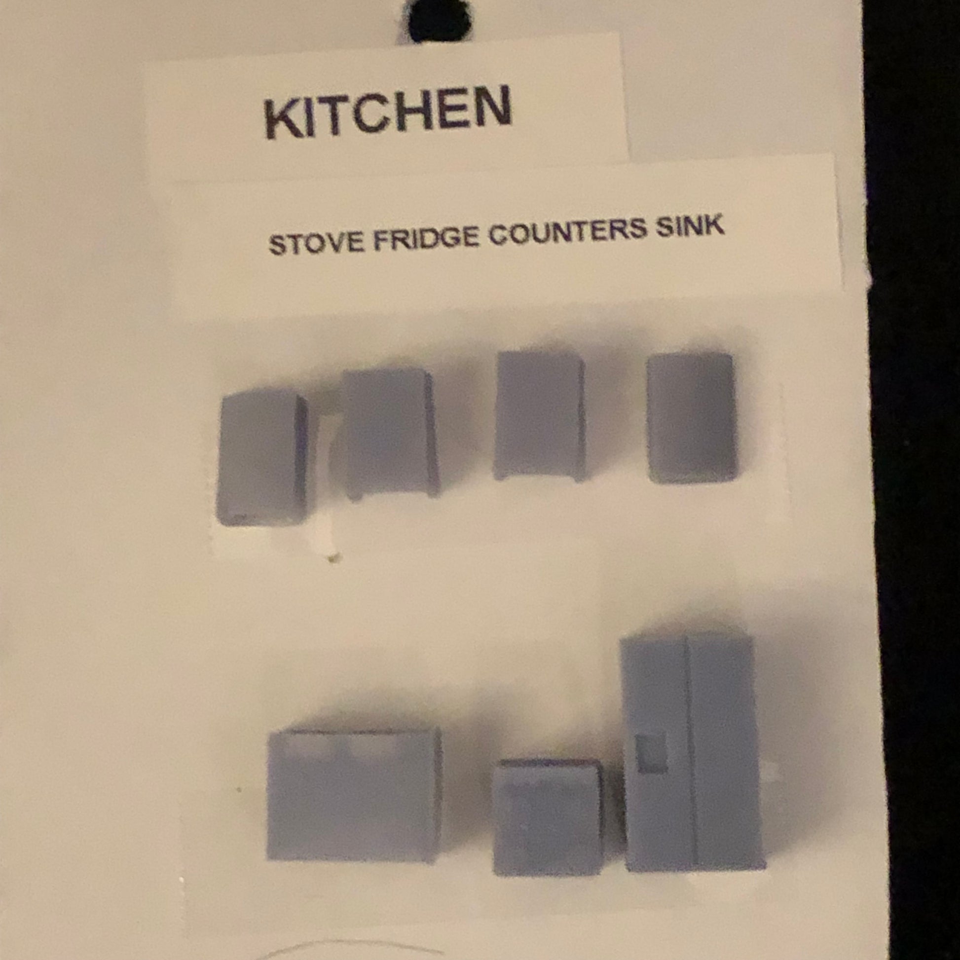 "Get cooking with this Ho scale model railroad kitchen set! Complete with a stove, refrigerator, sink, and 2 counters, it's perfect for adding realistic detail to your home. Now you can have all the amenities of a modern kitchen for your miniature world. Bon appétit!"