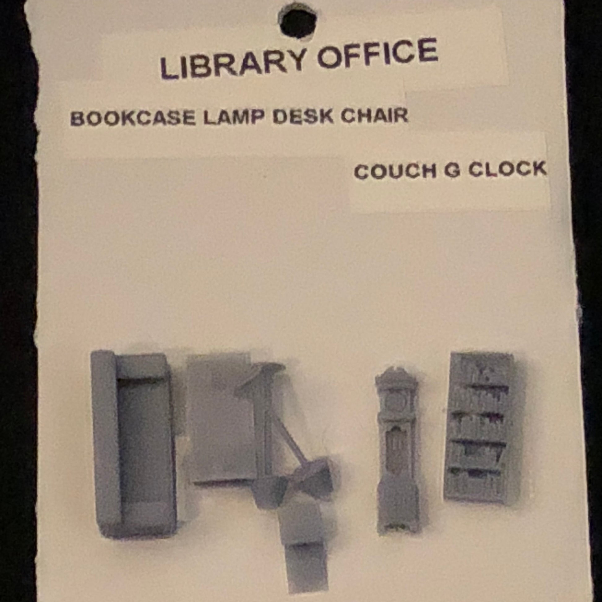 Create the perfect home or office setup for your model railroad with this Ho scale Library/Office set! Includes 1 bookcase, 2 floor lamps, 1 desk and chair, 1 couch, and 1 grandfather clock. Perfect for adding a touch of sophistication and charm to your miniature world.