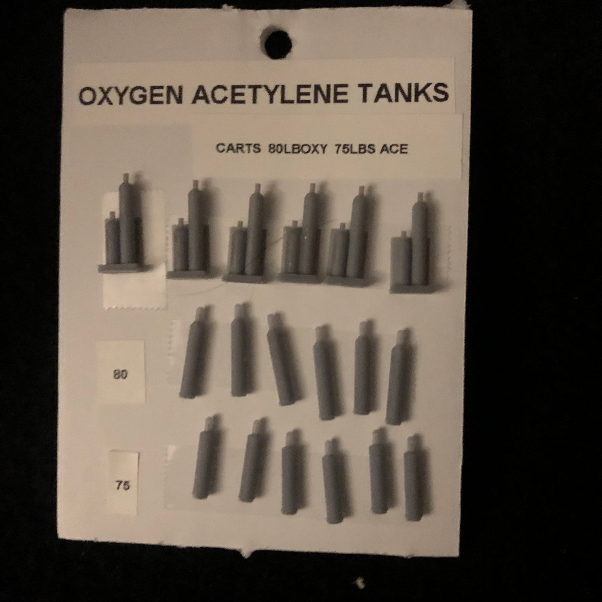 Fuel your HO scale model railroad scene with ease using these Oxygen Acetylene Tanks! Each set includes 6 carts and a mix of 80 lb. and 75 lb. tanks. Now you can bring even more realism to your layout with the added details of these miniature tanks.
